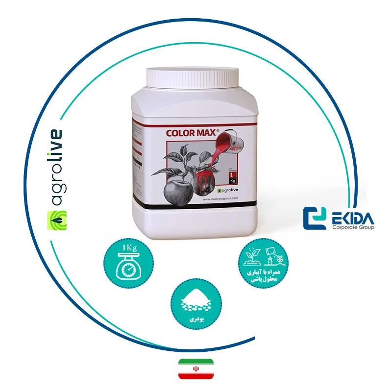 کود کالر مکس (COLOR MAX) اگرولایو یک محلول تغذیه‌ای ویژه برای ارتقاء رنگ، سایز و شیرینی میوه‌ها می باشد. این محصول با ترکیب متعادل پتاسیم، منیزیم و گوگرد، جذب این عناصر حیاتی را در گیاه افزایش داده و بطور مستقیم بر فرآیند رنگ‌گیری و رشد میوه تأثیر می‌گذارد. کالر مکس به اصلاح کمبود این عناصر کمک کرده و با بهبود متابولیسم گیاه، موجب زودرسی میوه و افزایش بازارپسندی آن می‌شود. نکته قابل توجه این است که کالر مکس فاقد هرگونه هورمون‌های مصنوعی است و مصرف محصولات تغذیه شده با این کود، کاملاً ایمن است. این ترکیب به ویژه برای باغداران و کشاورزانی که به دنبال بهبود کیفیت و افزایش فروش محصول خود هستند، توصیه می‌شود.