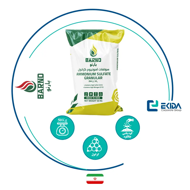 کود سولفات آمونیوم بارنو یک کود شیمیایی پرکاربرد برای اصلاح خاک‌های قلیایی و آهکی و تأمین هم‌زمان دو عنصر حیاتی ازت و گوگرد است. این کود با حلالیت بالا و اثر اسیدی مناسب به افزایش جذب عناصر غذایی و رشد بهینه گیاه کمک می‌کند. این محصول به دو فرم کریستال و گرانول موجود است.