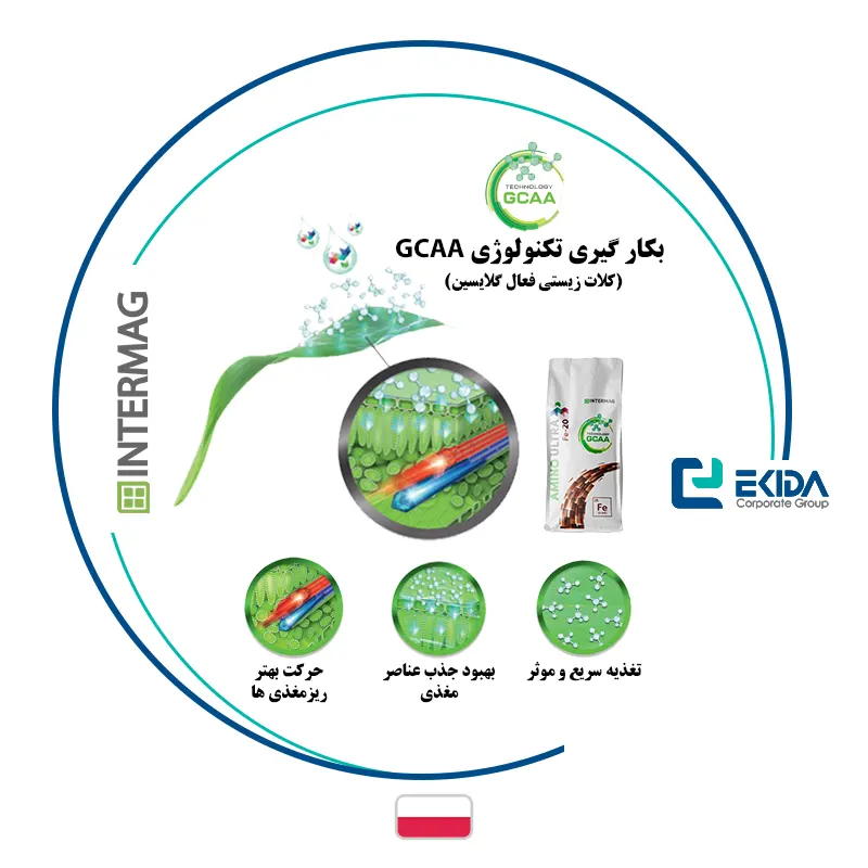 کود آمینو اولترا آهن اینترمگ یک کود با قابلیت محلول پاشی می باشد که بر پایه تکنولوژی GCAA (کلات زیستی فعال گلایسین) تهیه می شود. این محصول ترکیبی از آمینو اسید گلایسین و عنصر آهن است که باعث افزایش سرعت جذب و انتقال بالا در بافت گیاهان می شود.