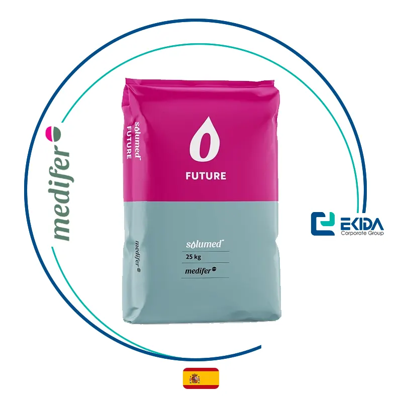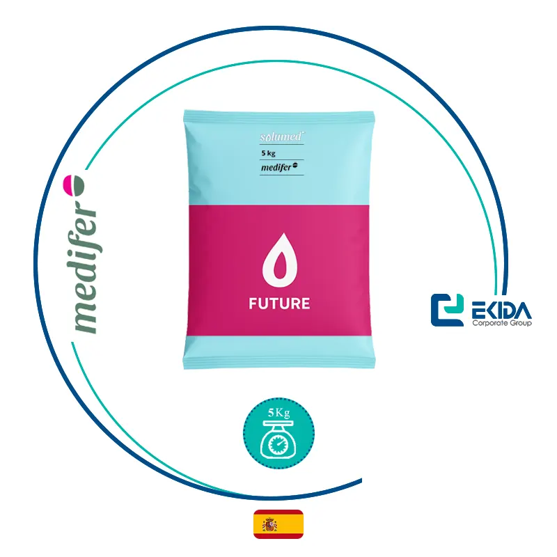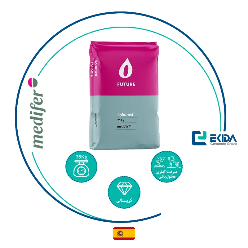 کود سولومد فیوچر مدیفر (Solumed Future) یکی از پیشرفتهترین کودهای پتاسیمدار در بازار جهانی است که به شکل کریستال محلول در آب تولید شده و در گروه کودهای زایشی با عملکرد بالا قرار میگیرد. این کود با درصد بالای پتاسیم، بهبود گلدهی و افزایش کیفیت و رنگدهی میوهها را بههمراه دارد. در ترکیب سولومد فیوچر از مجموعهای از عناصر ضروری و ریزمغذیها استفاده شده که بهصورت کلات EDTA فرموله شدهاند. از جمله عناصر: آهن، روی، مس، منگنز، منیزیم، گوگرد، مولیبدن، نیتریک اسید، نیترات منیزیم، سیترات آمونیوم و مونوپتاسیم فسفات در ترکیب این محصول موجود می باشند.